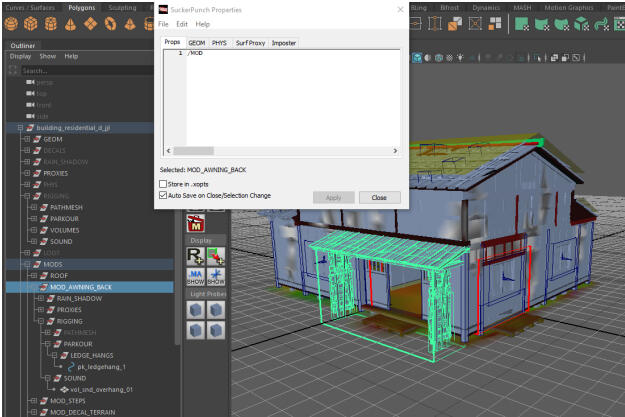 3. Many of the buildings were like legos, in which they could be combined with moderations based on how the design and environmentslayout team choose to place them. This meant mods could be toggled off or on depending on the choices made. This meant we needed to account for an awning requiring an overhang volume, but only when that mod was enabled. To begin the process of rigging, I would disable all the mods, so only the base asset would be visible to me. Then address each sound requirement per mod for the building.