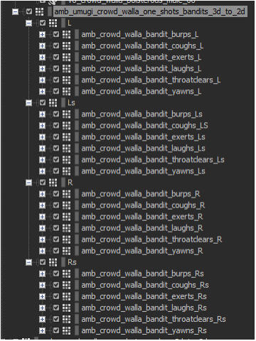We needed to bring some life to some of the bandit towns and something we could use nearly universally within some of the Japanese towns as well. I took my jumping off point to design appropriate walla by reviewing some Japanese samurai films. We wanted the walla to have some cultural accuracy mixed with the style of film that Ghost of Tsushima is ultimately inspired by.Originally, we didn’t have any dialogue lines from peds that would help set the mood to create a good walla bed. I prototyped a sort of fake language breaking down the Japanese language phonetically and recorded some of my co-workers speaking the nonsense words. This ultimately didn’t make it into the game but allowed us to secure additional resources for our friends over at J-Studio to record some real Japanese walla to implement into the game.In addition to that, I recorded several variations of exertions you may hear such as burps, coughs, laughs, throat clears, and yawns. I put this into a quad setup with Right and Left front as well as Right and Left Back channels.