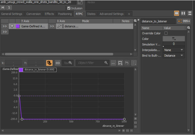 Next, I added a distance parameterto the RTPC, this allowed to collapse the event from a 3d quad loop to stereo as you close the distance to the source of the emitter.
