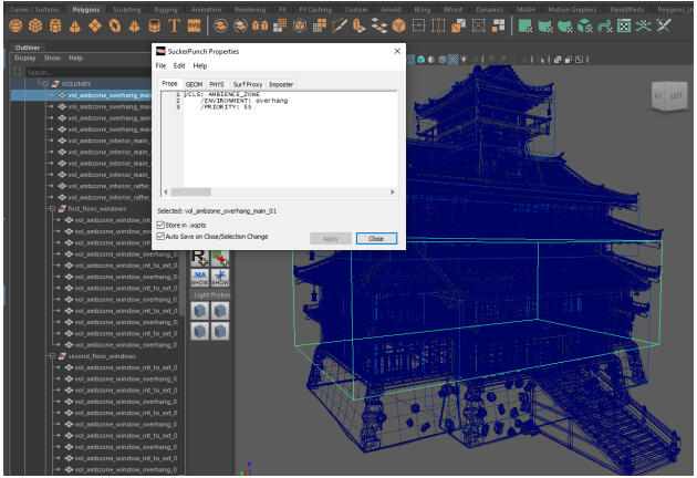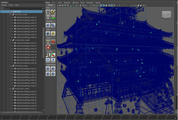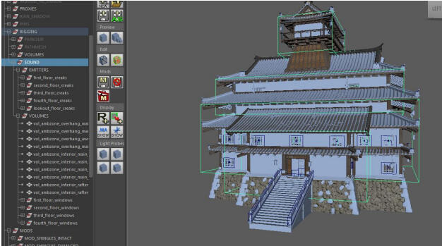 5. Emitters: Initially, we were hand placing rain emitters on the roof tops. We worked with engineering to automate that process through our ambience system. Rain emitters hand placed were done sparingly. Working with our Senior Sound Designer Josh Lord, we came up with the idea to use a blend of rain sounds for both external and internal,so the rain changes based on which volume the listener is in.Building Creaks helped give the buildings some character, we placed these in the rafters or around joists so as the wind blows through, the creaks would make the building responsive. We had several types of creaks depending on the state of the building – the more destroyed, the more creaking there may be.Windows with slats get emitters for wind blowing through the slats. Shoji Screen Windows get emitters for rattling wood and paper in the wind.