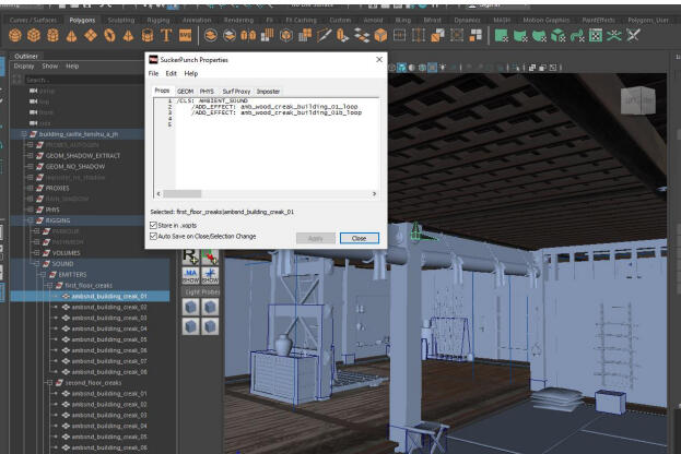 1. All the assets used to create a building needed to have the appropriate surface material types selected. This accounted for footstep type sounds based on the material.